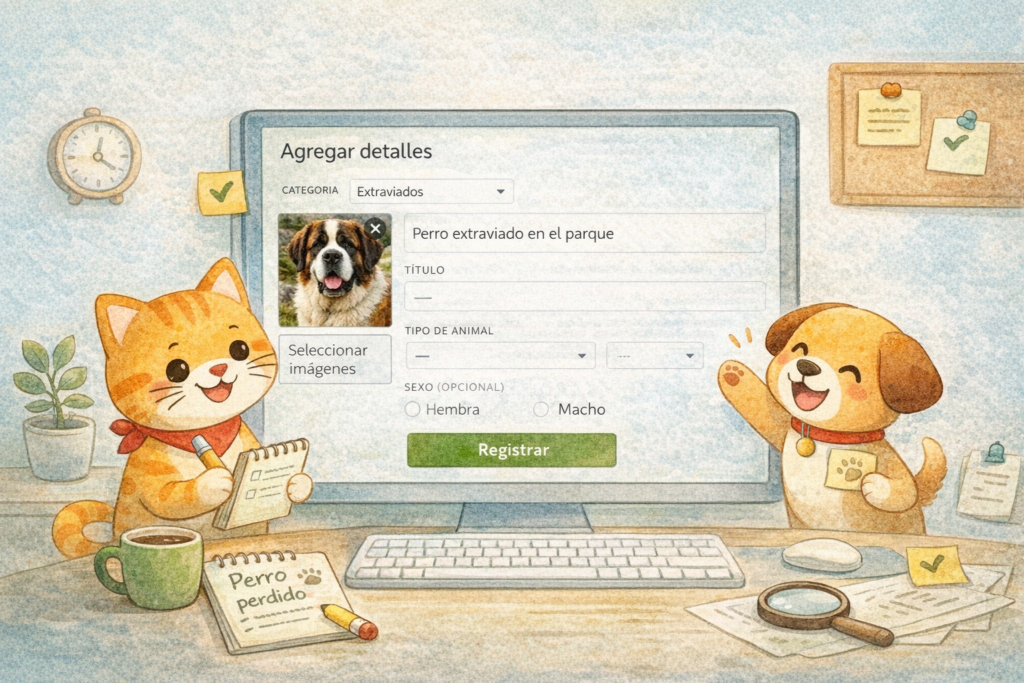 3 Llena todos Items solicitados, con el mayor detalle posible, verifica que las fotos sean claras y se muestre a la mascota y presiona ENVIAR UN ANUNCIO